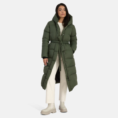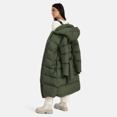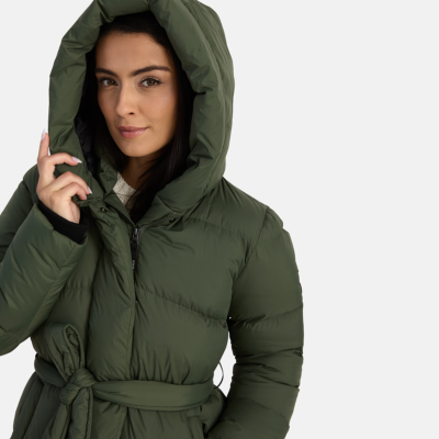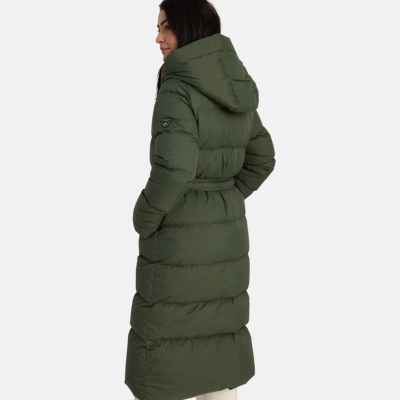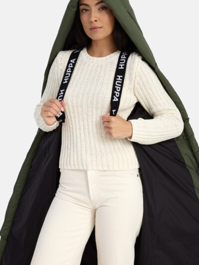 A women’s down coat that is water-repellent, windproof, and built for warmth, comfort, and protection. The breathable outer fabric is made from recycled fibres. Soft lining fabric inside the coat. Filled with feathers and down feathers. Ribbed cuffs on sleeves. Front two-way zipper with a snap button placket. The coat has removable elastic suspenders. Reflective detailing on outer fabric.