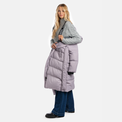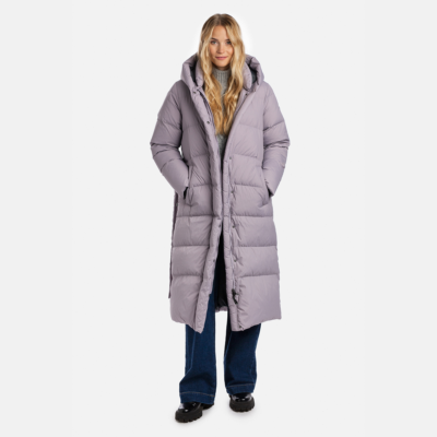 A women’s down coat that is water-repellent, windproof, and built for warmth, comfort, and protection. The breathable outer fabric is made from recycled fibres. Soft lining fabric inside the coat. Filled with feathers and down feathers. Ribbed cuffs on sleeves. Front two-way zipper with a snap button placket. The coat has removable elastic suspenders. Reflective detailing on outer fabric.