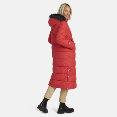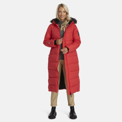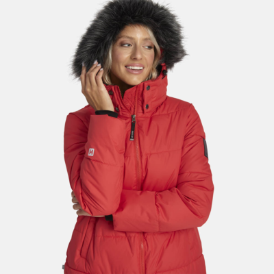 Women’s water- and windproof winter coat with 400 g insulation. Breathable outer fabric. Soft lining fabric inside the coat. Detachable hood fastens to the collar with snap buttons. Ribbed cuffs on sleeves. Rubber cord tunnel with stoppers on the waistline. Front two-way zipper. Detachable faux fur trim on hood. Reflective detailing has been added to the outer fabric of the coat for better visibility in the dark.