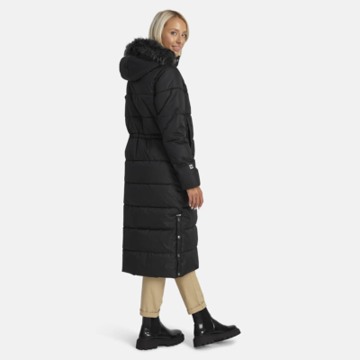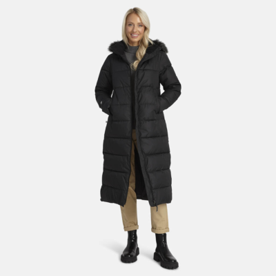 Women’s water- and windproof winter coat with 400 g insulation. Breathable outer fabric. Soft lining fabric inside the coat. Detachable hood fastens to the collar with snap buttons. Ribbed cuffs on sleeves. Rubber cord tunnel with stoppers on the waistline. Front two-way zipper. Detachable faux fur trim on hood. Reflective detailing has been added to the outer fabric of the coat for better visibility in the dark.