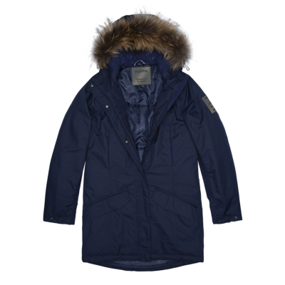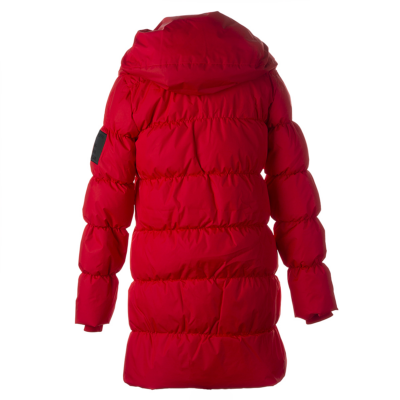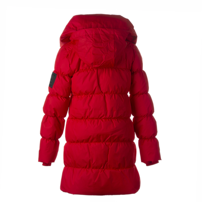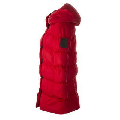 Modern women’s waterproof and windproof down coat. Breathable fabric. Soft lining on the inside. Down feathers and feathers for filling. Hood hidden in collar. Ribbed cuffs at sleeve ends. Two-way zipper covered with stud-press flap at front. Side seam pockets. Reflective logo on sleeve.