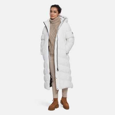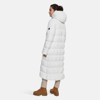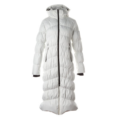 Women´s waterproof and windproof down coat. Breathable outer fabric. Soft lining fabric. Filled with down and feathers. Removable hood attaches to the collar with a zipper. Ribbed cuffs at the sleeve ends. Two-way zipper closure, snap closure at the bottom. Reflective details on the outer fabric.