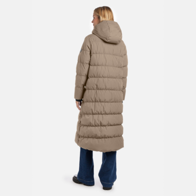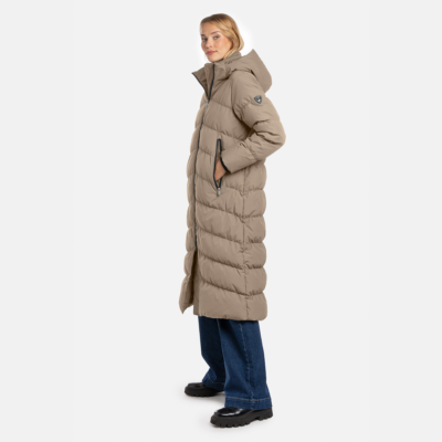 Women´s waterproof and windproof down coat. Breathable outer fabric. Soft lining fabric. Filled with down and feathers. Removable hood attaches to the collar with a zipper. Ribbed cuffs at the sleeve ends. Two-way zipper closure, snap closure at the bottom. Reflective details on the outer fabric.