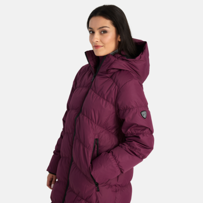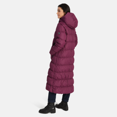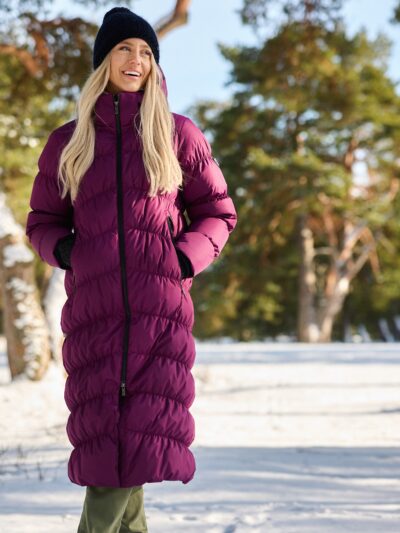 Women´s waterproof and windproof down coat. Breathable outer fabric. Soft lining fabric. Filled with down and feathers. Removable hood attaches to the collar with a zipper. Ribbed cuffs at the sleeve ends. Two-way zipper closure, snap closure at the bottom. Reflective details on the outer fabric.