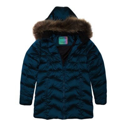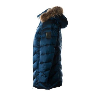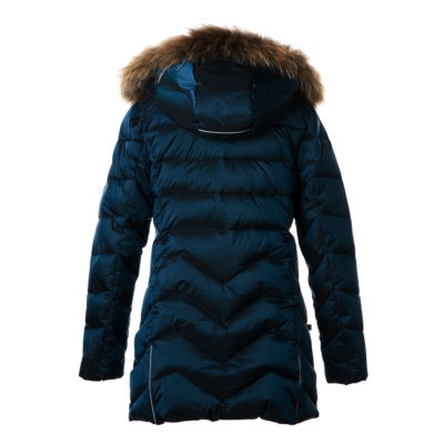 Women’s waterproof and windproof quilted winter coat. Breathable fabric. Soft lining on the inside. Removable snap-on hood. The coat is filled with innovative recycled material imitating the properties of feather fill. The material is warm, dries quickly and does not clump after washing. A great alternative to natural feather fill. Removable natural fur trim on hood. Reflective elements on fabric. Two zippered pockets at front for gloves or other necessities.
