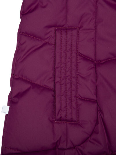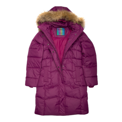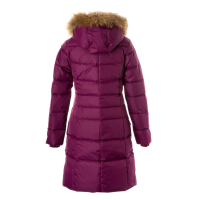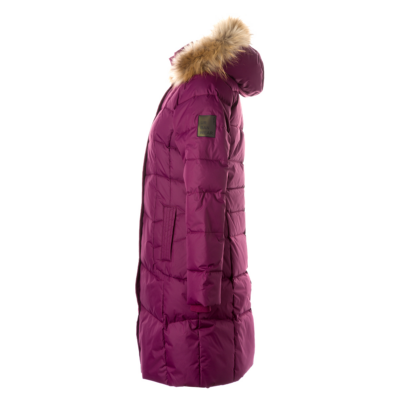 Stylish waterproof and windproof womens´ down coat. Breathable fabric. Soft lining on the inside. Down feathers and feathers for filling. Removable snap-on hood. Ribbed cuffs at sleeve ends. Two-way zipper covered with stud-press flap at front. Removable natural fur trim on hood. Reflective elements on the top fabric to add visibility in the dark.