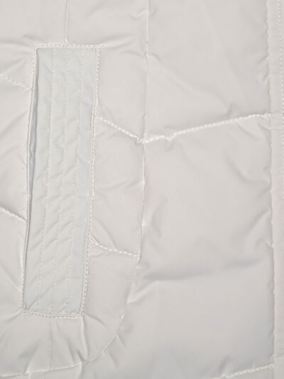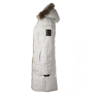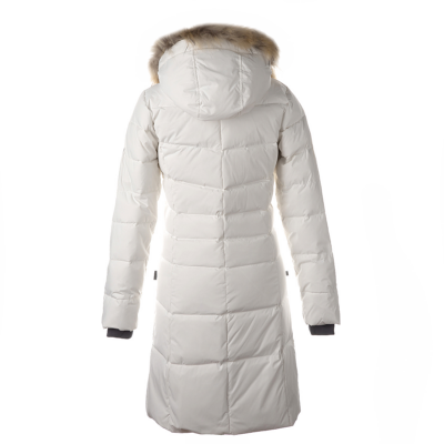 Stylish waterproof and windproof womens´ down coat. Breathable fabric. Soft lining on the inside. Down feathers and feathers for filling. Removable snap-on hood. Ribbed cuffs at sleeve ends. Two-way zipper covered with stud-press flap at front. Removable natural fur trim on hood. Reflective elements on the top fabric to add visibility in the dark.