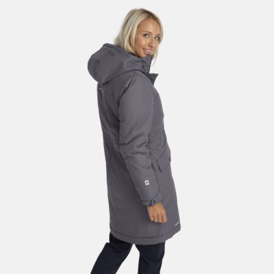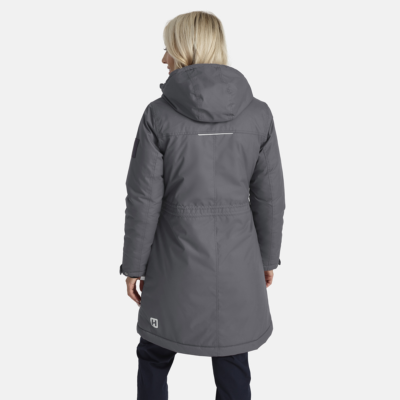 Women’s water- and windproof winter parka with 300 g insulation. Breathable outer fabric. Soft lining fabric inside the parka. Adjustable hood and sleeve cuffs. Rubber cord tunnel with stoppers on the waistline. Waterproof taped seams. Reflective detailing on outer fabric.
