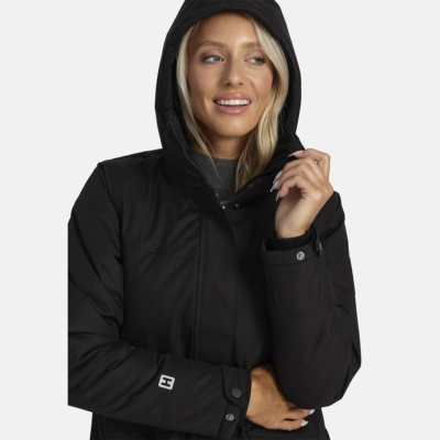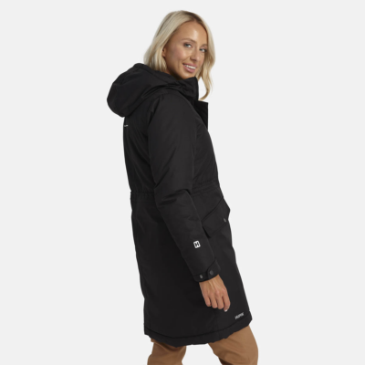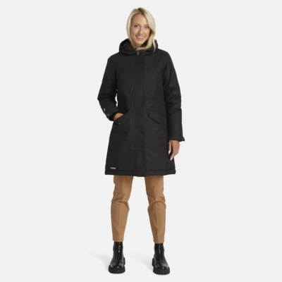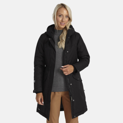 Women’s water- and windproof winter parka with 300 g insulation. Breathable outer fabric. Soft lining fabric inside the parka. Adjustable hood and sleeve cuffs. Rubber cord tunnel with stoppers on the waistline. Waterproof taped seams. Reflective detailing on outer fabric.