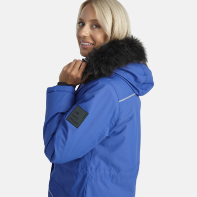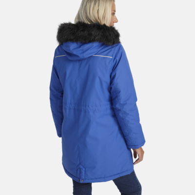 Women’s waterproof and windproof winter parka. Breathable fabric. Soft lining on the insid.e Removable snap-on hood. Ribbed cuffs at sleeve ends. Drawstring tunnel with stoppers on waist. Waterproof taped seams. Faux fur trim on hood. Reflective elements on fabric.