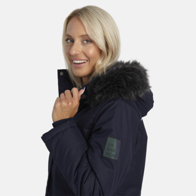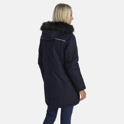 Women’s waterproof and windproof winter parka. Breathable fabric. Soft lining on the insid.e Removable snap-on hood. Ribbed cuffs at sleeve ends. Drawstring tunnel with stoppers on waist. Waterproof taped seams. Faux fur trim on hood. Reflective elements on fabric.