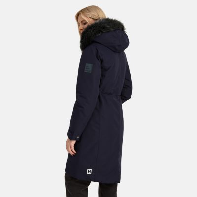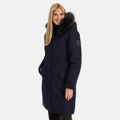 Women’s water- and windproof winter parka with 200 g insulation. Breathable outer fabric. Soft fabric on the inside of the parka. Sheepskin imitation lining at the upper back and inside of the hood. Adjustable hood. Ribbed cuffs on sleeves. Adjustable sleeve cuffs. Front two-way zipper with a snap button placket. Rubber cord tunnel with stoppers on the waistband. Waterproof taped seams. Detachable faux fur trim on hood. Reflective detailing on outer fabric.