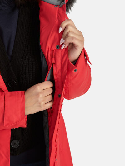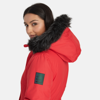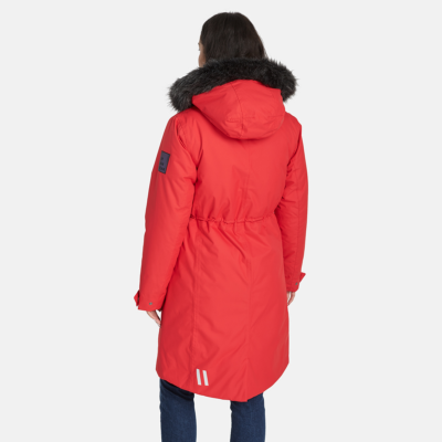 Women’s water- and windproof winter parka with 200 g insulation. Breathable outer fabric. Soft fabric on the inside of the parka. Sheepskin imitation lining at the upper back and inside of the hood. Adjustable hood. Ribbed cuffs on sleeves. Adjustable sleeve cuffs. Front two-way zipper with a snap button placket. Rubber cord tunnel with stoppers on the waistband. Waterproof taped seams. Detachable faux fur trim on hood. Reflective detailing on outer fabric.