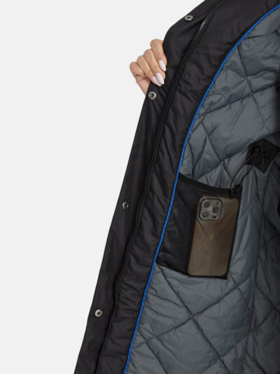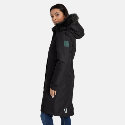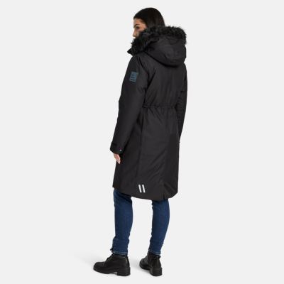 Women’s water- and windproof winter parka with 200 g insulation. Breathable outer fabric. Soft fabric on the inside of the parka. Sheepskin imitation lining at the upper back and inside of the hood. Adjustable hood. Ribbed cuffs on sleeves. Adjustable sleeve cuffs. Front two-way zipper with a snap button placket. Rubber cord tunnel with stoppers on the waistband. Waterproof taped seams. Detachable faux fur trim on hood. Reflective detailing on outer fabric.
