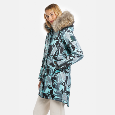 Women’s waterproof and windproof winter parka. Breathable fabric. Soft fabric on the inside. Faux sheepskin lining at the top of the back and inside the hood. Adjustable hood. Ribbed cuffs at sleeve ends. Lapped two-way zipper at front. Magnetic fastening on flap pockets. Drawstring tunnel with stoppers on waist for adjusting the waist from the inside. Waterproof taped seams. Removable natural fur trim on hood. Reflective elements on fabric.