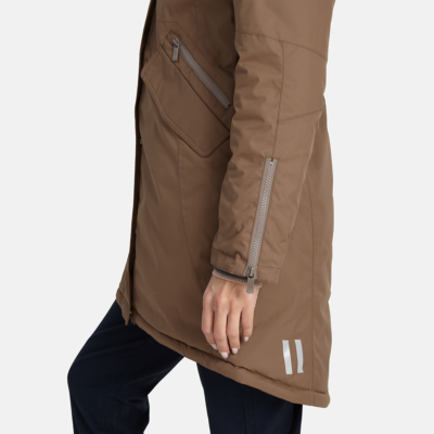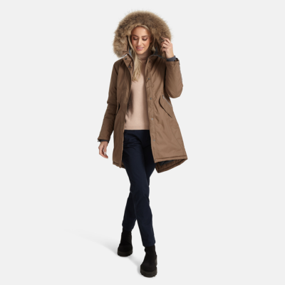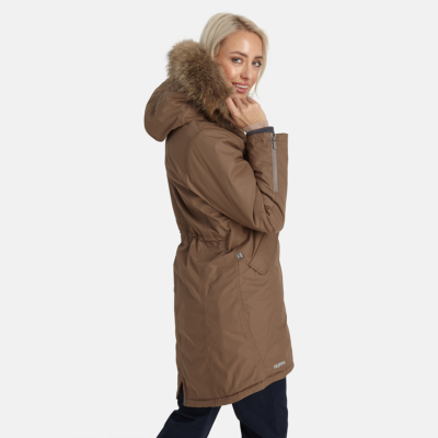 Women’s waterproof and windproof winter parka. Breathable fabric. Soft fabric on the inside. Faux sheepskin lining at the top of the back and inside the hood. Adjustable hood. Ribbed cuffs at sleeve ends. Lapped two-way zipper at front. Magnetic fastening on flap pockets. Drawstring tunnel with stoppers on waist for adjusting the waist from the inside. Waterproof taped seams. Removable natural fur trim on hood. Reflective elements on fabric.