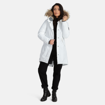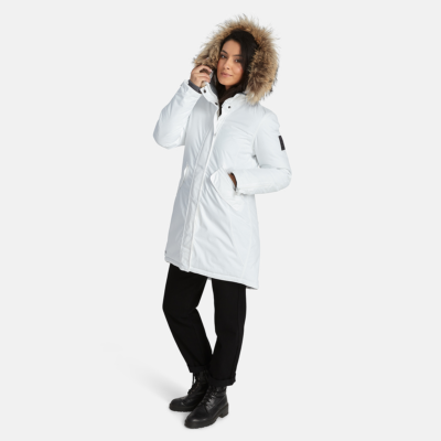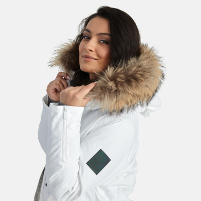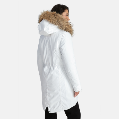 Women’s waterproof and windproof winter parka. Breathable fabric. Soft fabric on the inside. Faux sheepskin lining at the top of the back and inside the hood. Adjustable hood. Ribbed cuffs at sleeve ends. Lapped two-way zipper at front. Magnetic fastening on flap pockets. Drawstring tunnel with stoppers on waist for adjusting the waist from the inside. Waterproof taped seams. Removable natural fur trim on hood. Reflective elements on fabric.