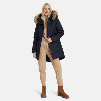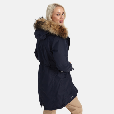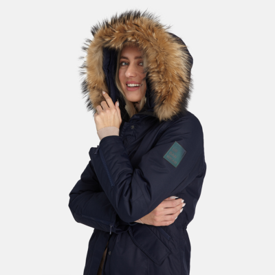 Women’s waterproof and windproof winter parka. Breathable fabric. Soft fabric on the inside. Faux sheepskin lining at the top of the back and inside the hood. Adjustable hood. Ribbed cuffs at sleeve ends. Lapped two-way zipper at front. Magnetic fastening on flap pockets. Drawstring tunnel with stoppers on waist for adjusting the waist from the inside. Waterproof taped seams. Removable natural fur trim on hood. Reflective elements on fabric.